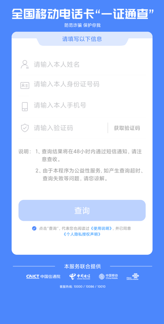 全国移动电话卡 "一证通查" 主要面向中国境内移动电话用户,用户可以通过网页、小程序等查询入口,输入证件信息、手机号码(现阶段仅支持二代居民身份证查询)并输入验证码核对为本人操作后,由服务平台向基础电信企业、移动通信转售企业分别查询用户名下移动电话卡数量,并由服务平台在 48 小时内通过 10699000 统一的短信端口回复用户查询结果。